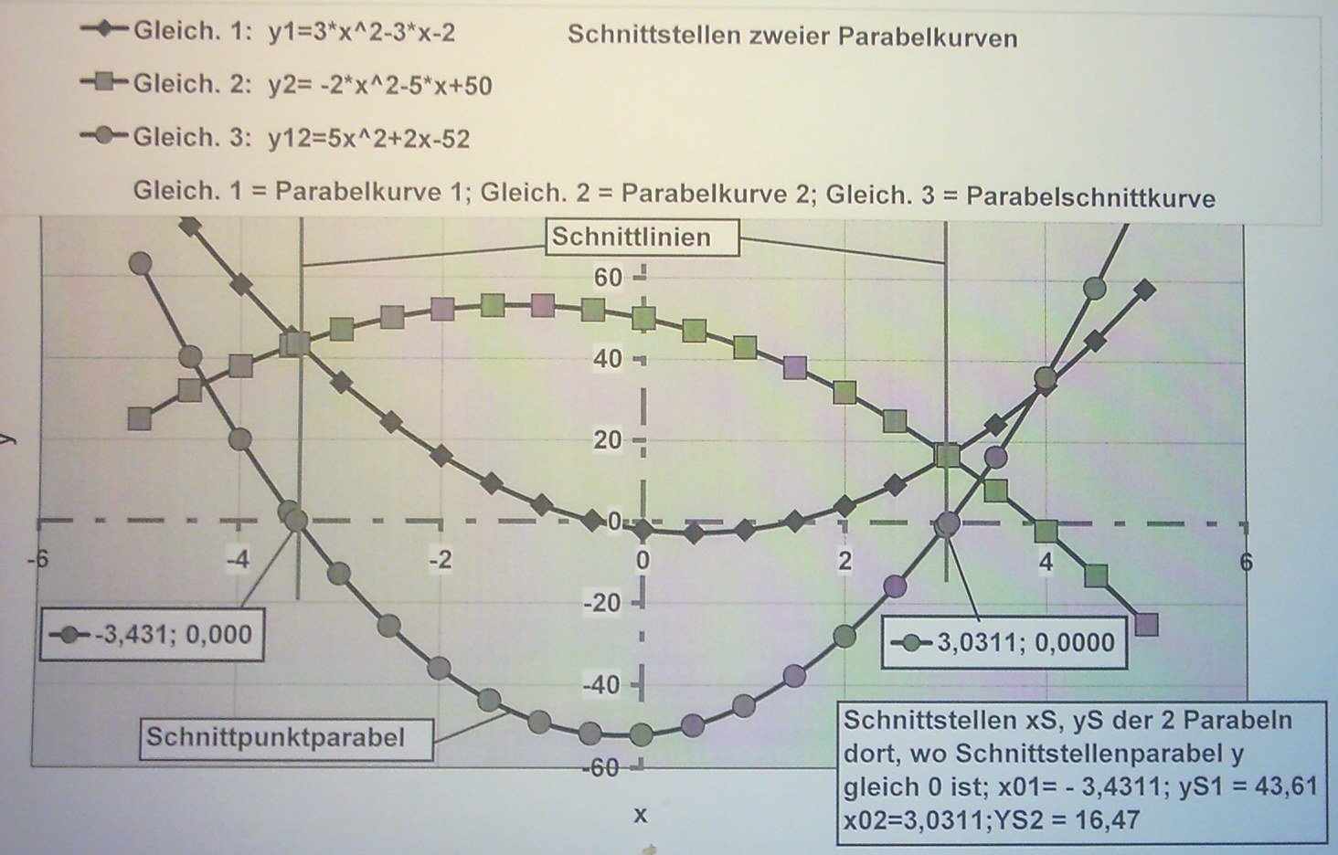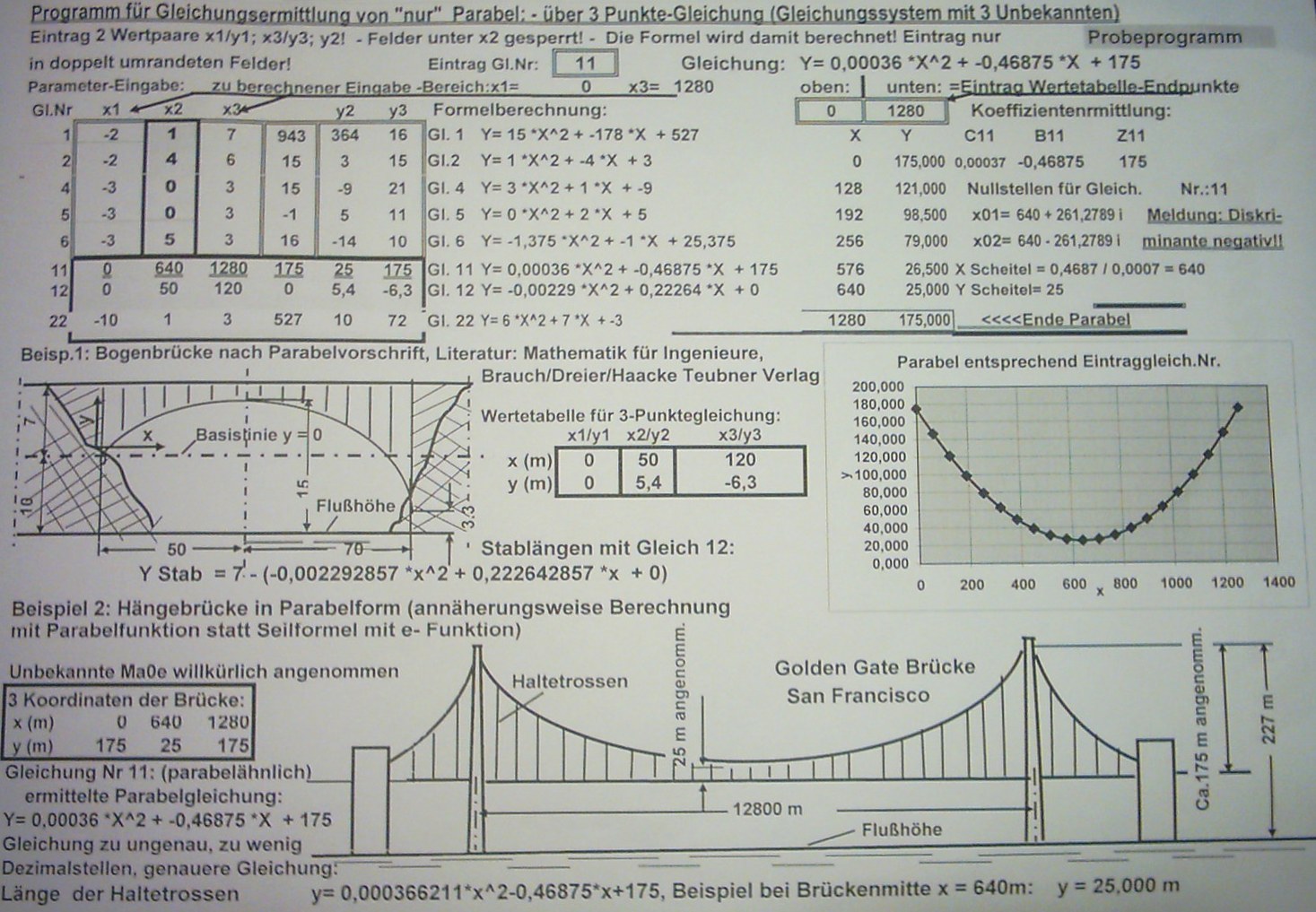 Wenn die Annäherung genau genug ist, wird die Gleichung dafür angezeigt, in der Regel in der Form y = C * x^n + B * x + Z, mit meistens ungeraden Exponenten, z.B. y = 122,456 * x^-5,26 + 215 * x + 354. Oder wenn linear (ohne Annäherungseintrag): y = C * x + B, z.B. y = 12,589 * x - 364. Oder falls klassische Kurvengleichung: y = 257 * X^2 + 36x + 338. Die Gleichung wird ohne Eintrag eines Annäherungsgrades sofort angezeigt! (siehe weitere Beispiele in der Datei "4-Punkte-Gleichung")