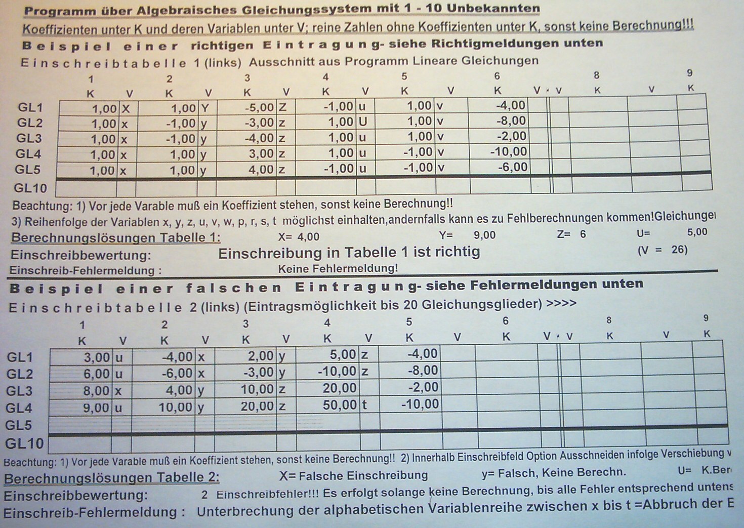 Algebraische Gleichungen 1. Grades bis 10 Unbekannte mit jeweils 20 Gleichungsgliedern. Einschreibmöglichkeiten in 12 Gleichungssysteme gleichzeitig. Anwendungsmöglichkeiten in Chemie und Statik, z.B. in der Verbrennungstechnik, wobei mehrere Gasarten zusammengeführt werden müssen und deren Reaktionsprodukte eine bestimmte Gaszusammensetzung haben müssen (Stöchiometrie).